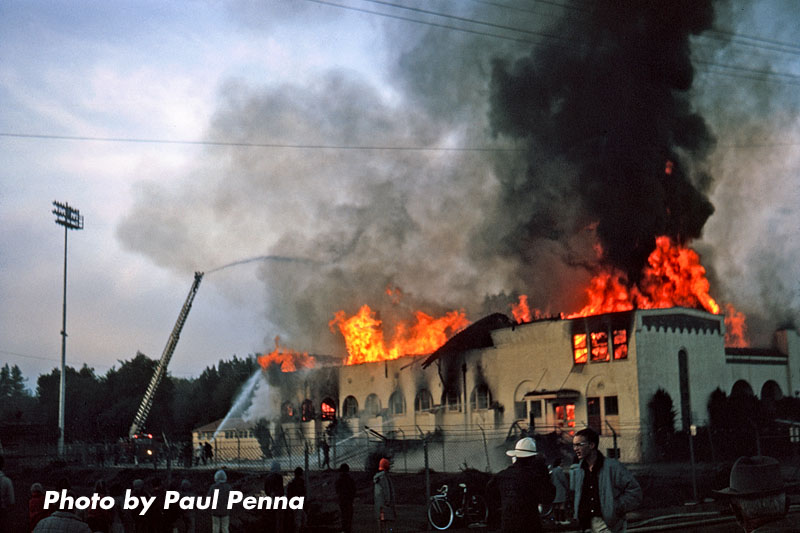 The fire occurred on Monday December 16, 1963, Arson was suspected, based upon eyewitness reports of an individual seen running from the building shortly before a large explosion blew out the windows, and the structure was soon engulfed in flames. The wooden gym floors with their multiple layers of varnish were cited as among the reasons for the intensity of the blaze. The I-J article says that the building had been condemned as a fire hazard by the Kentfield Fire Department three years earlier. Apparently it was still being used for PE classes, however, and it said that some COM teams had lost all their uniforms and other equipment in the fire. The building, built in 1931, was insured, and the article also states that the new "$1,5000,000" gym was already under construction at the time.
